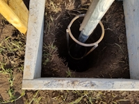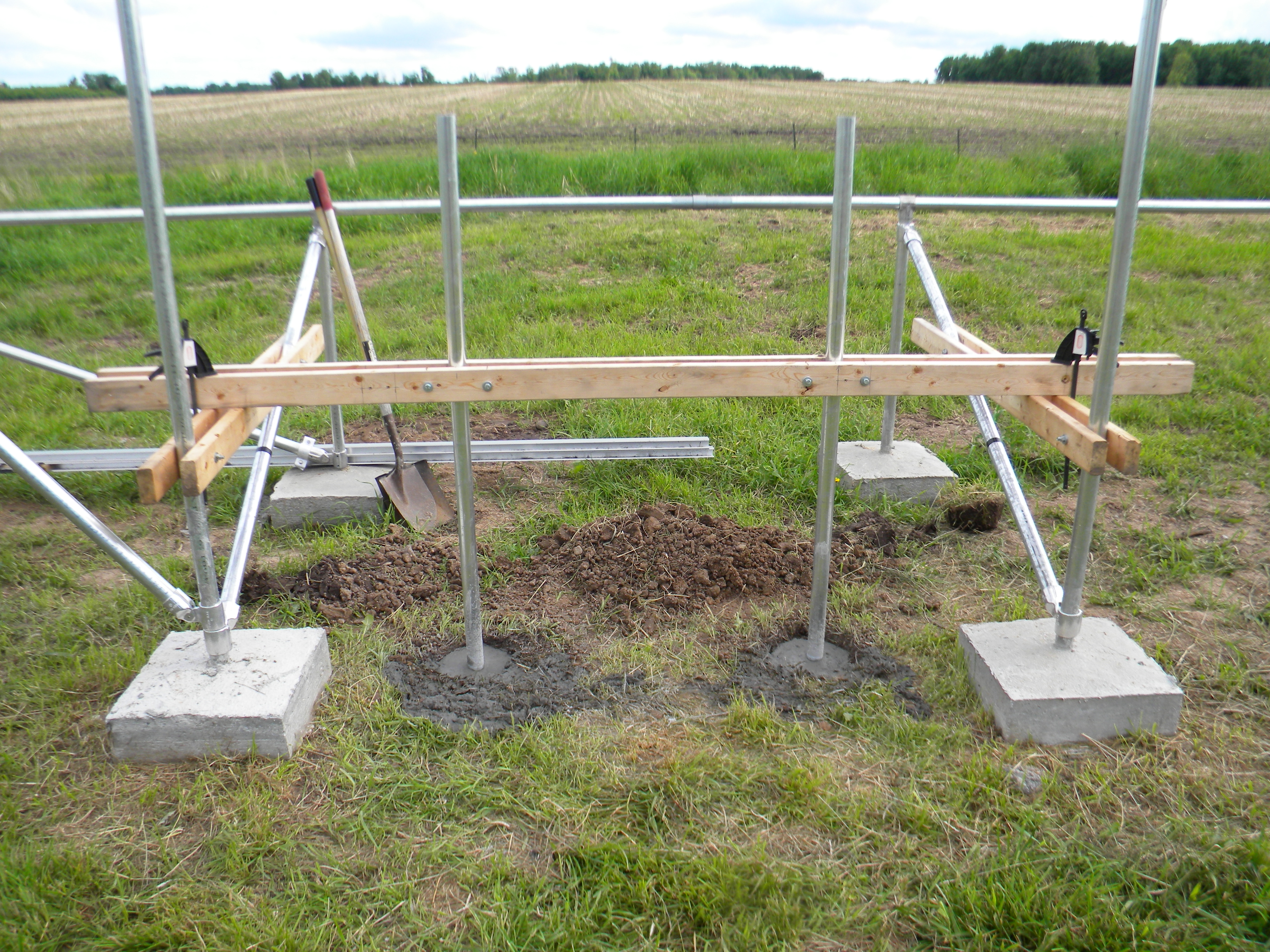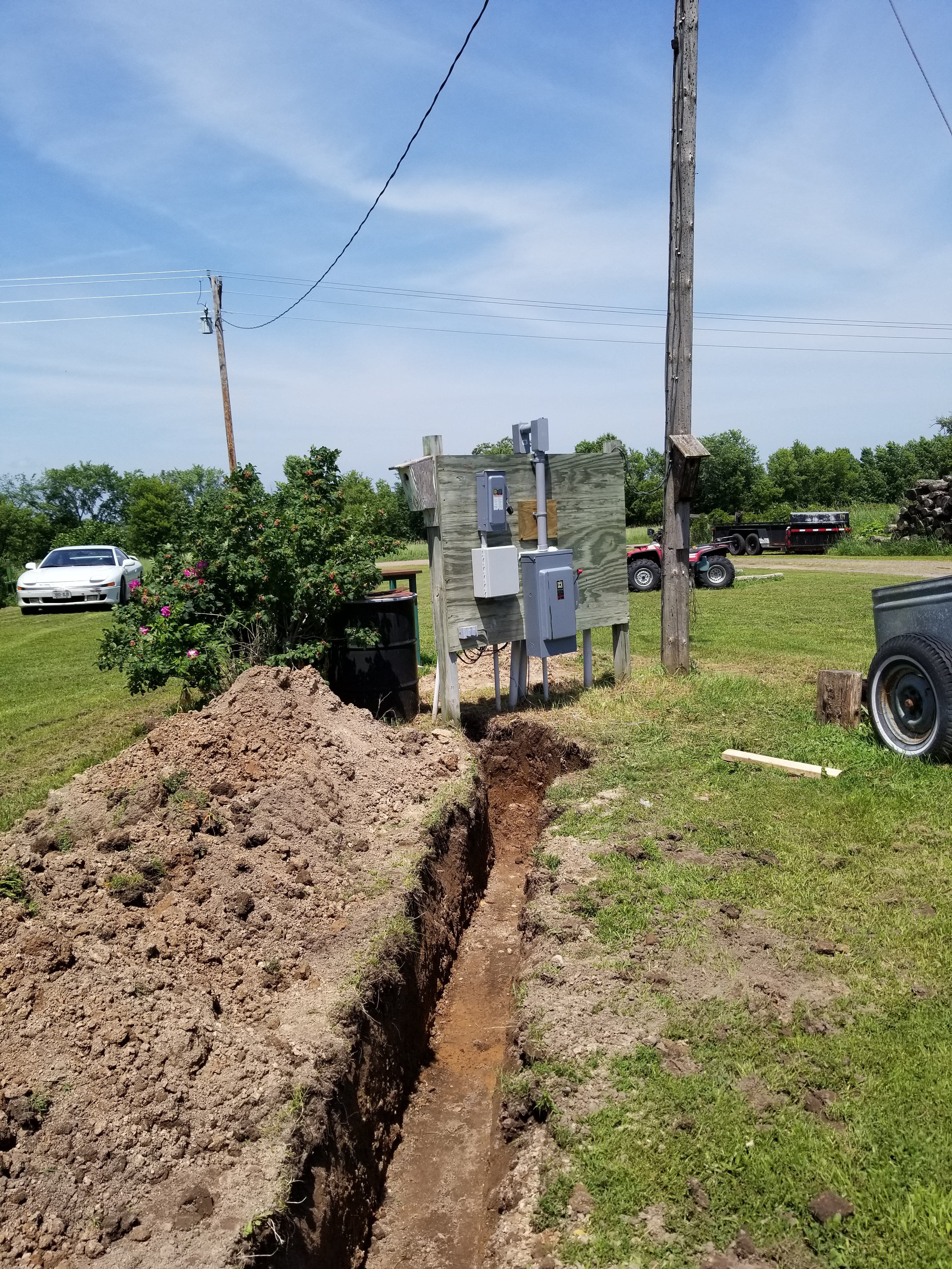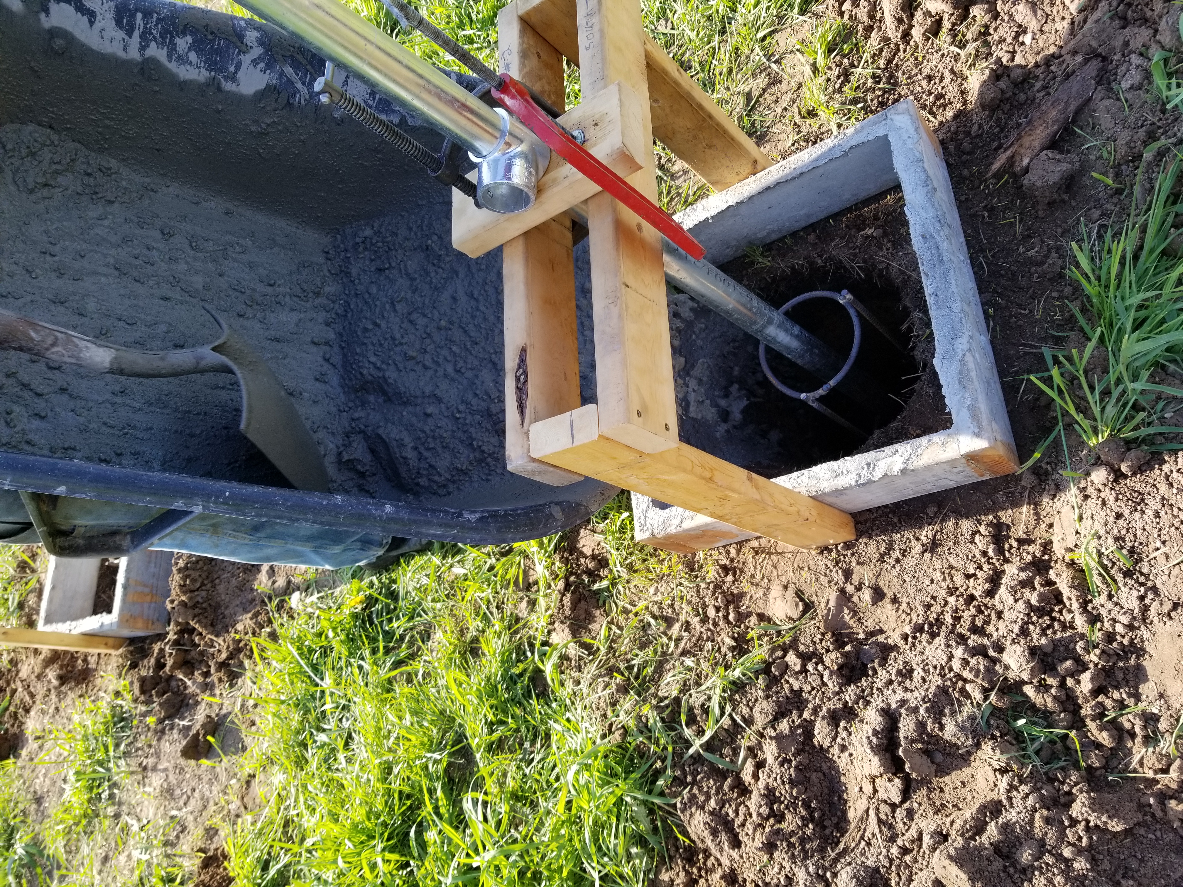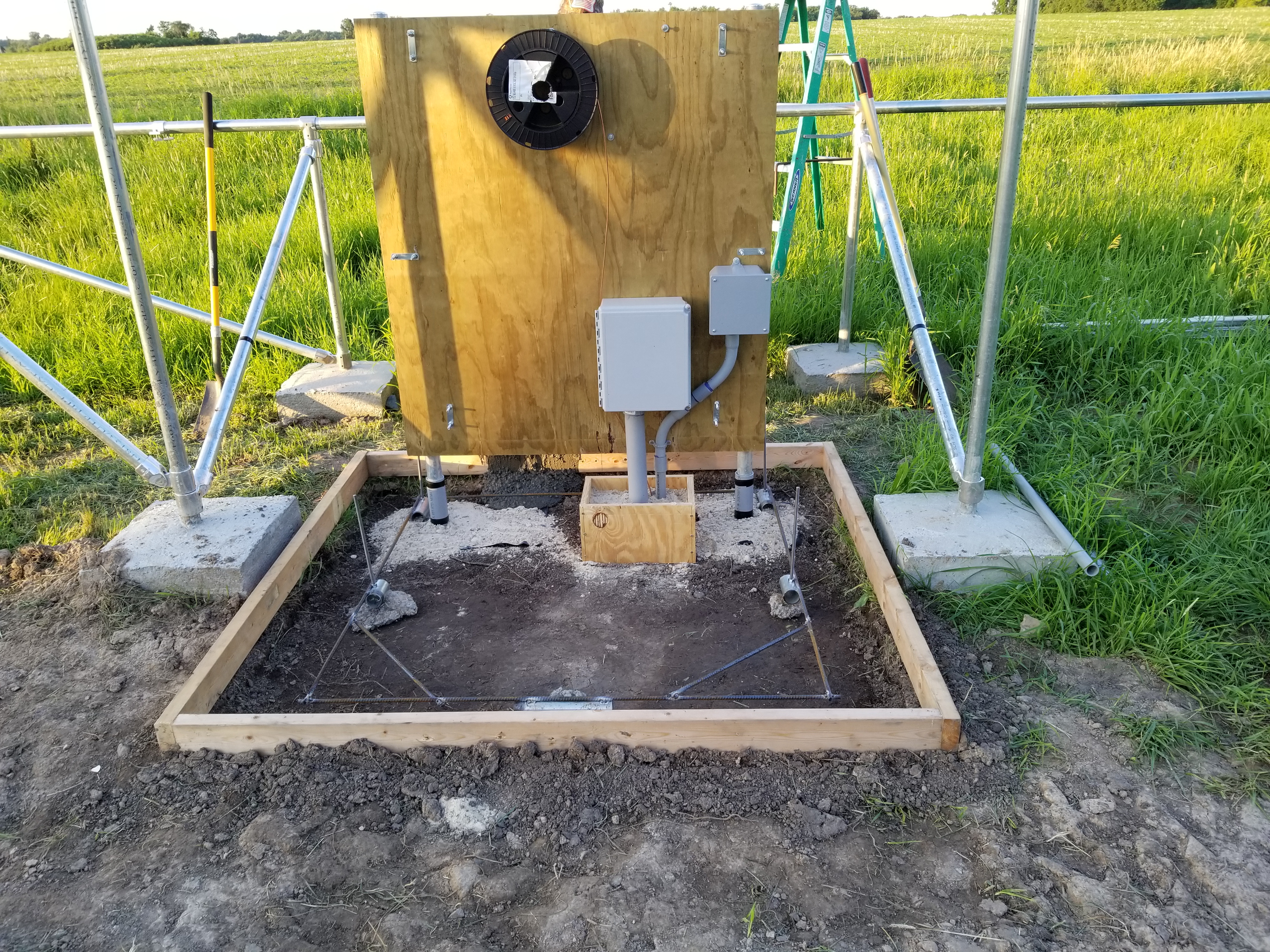 NOTE, the small wood box, around the conduit, and the short pieces of PVC around the two poles. The idea here is knowing that the cement slab is going to move around a little bit, due to the frost, we are hoping to isolate the slab from the poles and the conduit to allow the slab to move without putting pressure on the poles and conduit. We’ll see in a few years how that all works out. The PVC was a cut from an extra piece of conduit that I split in half with a hack saw. I then taped it back together around the poles with electrical tape. The re-rod has vertical threaded rods welded to it to eventually bolt down the ‘Fronious Closet’. |