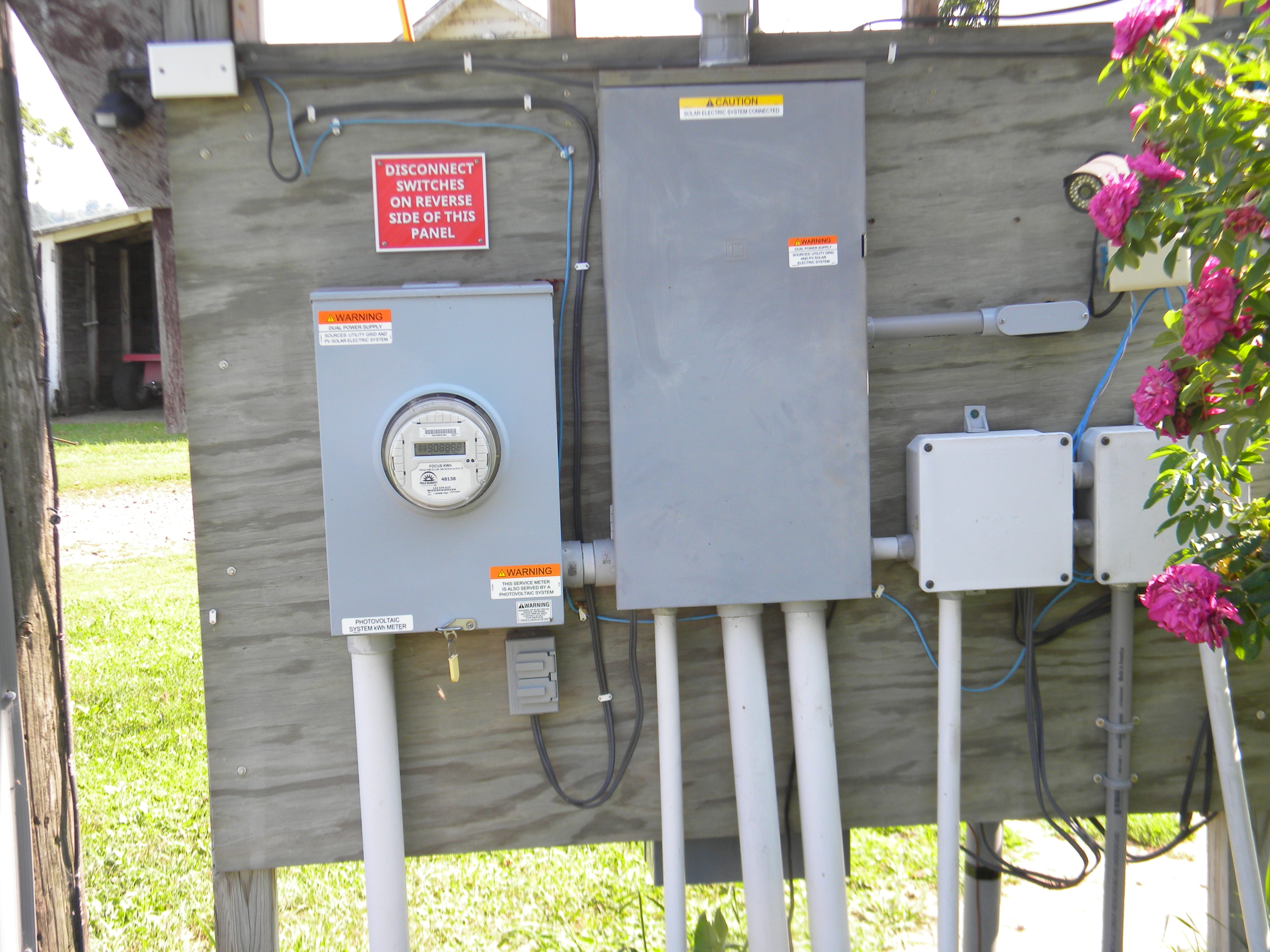 NOTE: Part of the co-generation agreement with Polk Burnett Electric, is that they can come on the property and lock out this switch, any time it is necessary to perform work on the grid. The box on the lower left is a junction box that is serving more or less as an adapter, sizing down the 2” conduit to 1” which fits the switch box without modification. There are many ways we could have downsized the conduit. I chose the junction box so that I could leave a loop of extra wire in there just in case I need it in the future. The Box mounted lower on the right side is a disconnect switch that completely shuts off the power coming from the grid. I installed that more for personal preference, and protection then necessity. |