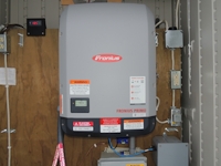 The large box with the exposed wiring is the mount for the Fronius solar inverter. The D.C. voltage comes in from the solar panels on the left side. The RED wires are simply black wires covered with red heat shrink to differentiate the positive and negative leads. The A.C. voltage goes out the right side. The large WHITE wire again, is simply a black wire with white heat shrink, to show that it is the neutral wire. The large bare wire is of course the #6 awg ground wire that I mentioned a few pictures up. The smaller wires are the ‘Hot’ (L1) neutral and ground of the small branch circuit to supply power to the outlets and fan. |