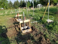Anyone with some basic knowledge of geometry could probably whip these numbers out with a calculator. Anyway, armed with some layout measurements, and a tape measure, my wife and I went out and put some stakes in the ground just as soon as the ground was soft enough to drive a stake into.